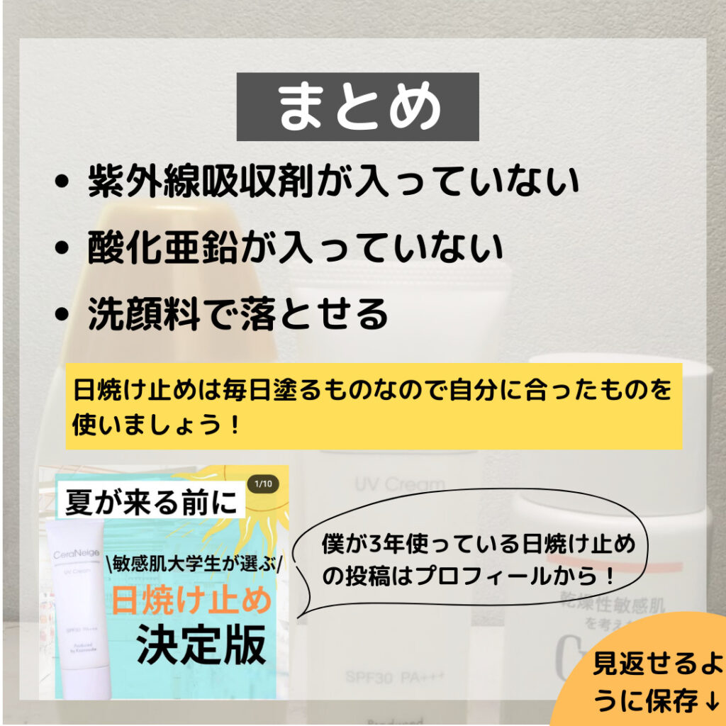 以上の3つを満たすために僕は酸化チタンという紫外線散乱剤のみ入っているものを使っていて、こちらの記事 で紹介しています!