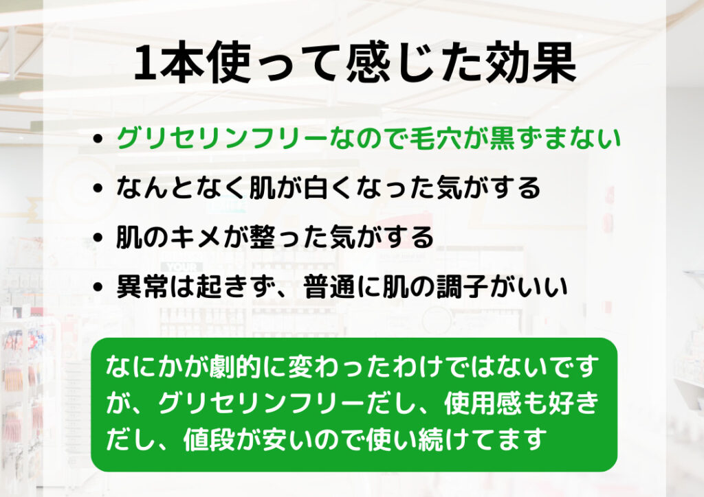 正直劇的になにかが変化したわけではありませんが、グリセリンフリーなのと価格が安いので使い続けています!ただニキビとかはできないのでニキビ対策としてはよいと思います!