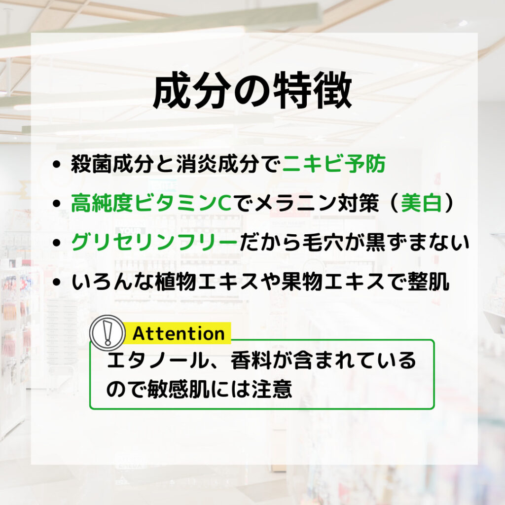 かなりさまざまな効果が期待できる多機能な化粧水です!ビタミンCは皮脂抑制効果もあるとされているのでテカリ対策もできます!