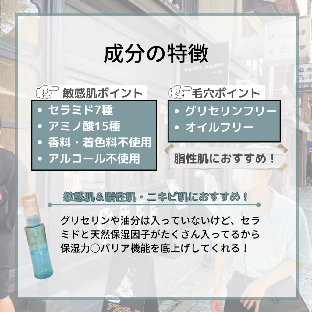 セラミド7種+アミノ酸が14種も含まれていて、グリセリンフリーなのに保湿力が高めです!