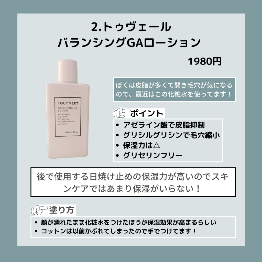 - <現役大学生のメンズスキンケア朝ver.>2. トゥヴェール バランシングGAローション:ニキビ・テカリ・毛穴ケアに!