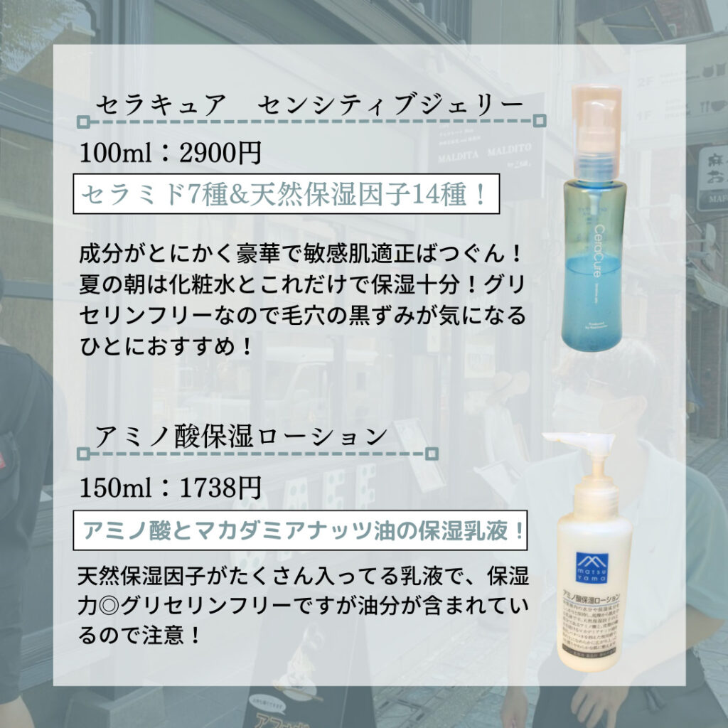 この保湿ジェルはかなり敏感肌適正が高くて、セラミド7種とアミノ酸14種を配合していて保湿力も低くないです!どんな肌質のひとが使っても問題ないです!